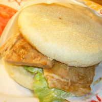 イングリッシュマフィンに厚木名物の豚漬けがレタスと共に挟まれている一品